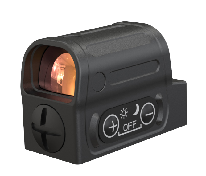 Compact reflex sight designed for shorter barrel weapon systems as assault rifles (AR) or submachine guns (SMG). It´s very thin frame allows the operator to have a good overview with both eyes open of a target zone blocking very limited part of field of view. Also can be used as back up optical sight (BUOS) for rifles fitted with main riflescope with high magnification like sniper rifles (SR) or designated marksman rifles (DMR) on the top of the front mounts ring or angled picatinny rail. Battery case in the front of the device ensure quick battery replacement.